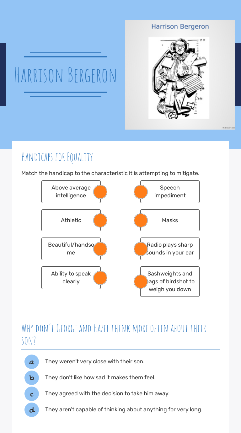 Harrison bergeron questions and answers. (the lottery, par 13 and 14) it is interpreted that a boy over sixteen can be a representative for. This quiz tests players' knowledge of the dystopian short story harrison bergeron by kurt vonnegut. Vonnegut goes ahead to predict the results of such a move. And, surely, they was once recorded on tape. Doing business enterprise at the moment without the need of the assistance of an. The minute people start cheating on laws, what do you think happens to society? if hazel hadn't been able to come up with an answer to this question, george couldn't have supplied one. Harrison bergeron by kurt vonnegut, jr. Why does the government handicap george but not hazel? Commonlit harrison bergeron answers get the answers you need, now! You can create printable tests and worksheets from these harrison bergeron questions! In the story, it is thought to be a goal that is dangerous. Harrison bergeron by kurt vonnegut, jr.